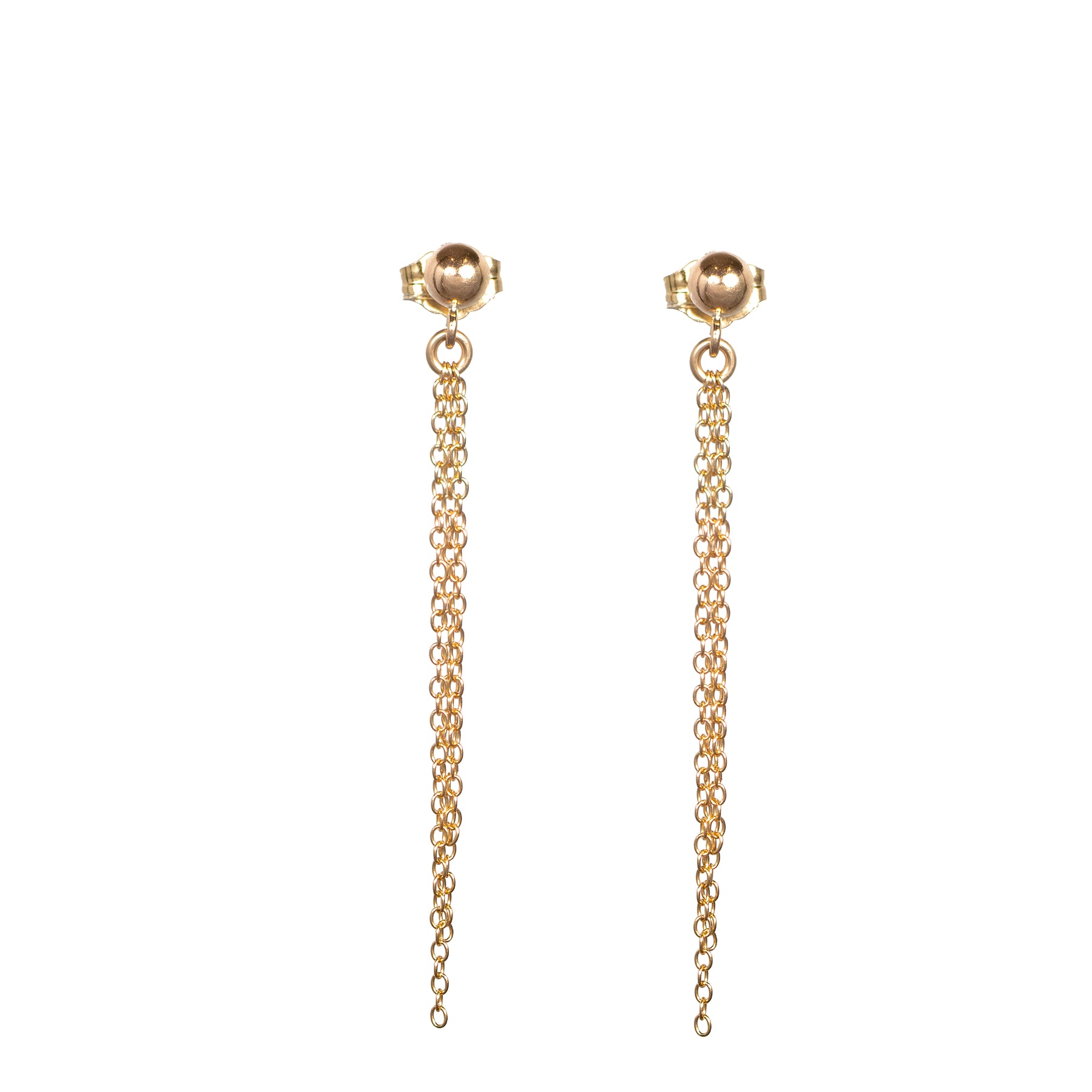 Este arete de Oro laminado 18k es una preciosa joya para lucir en cualquier momento. El sistema de ajuste a la oreja es una topo de 4 mm de diámetro, mientras que las 3 cadenas son colgantes de diferentes longitudes. Esta pieza lujosa será un complemento perfecto para cualquier look.