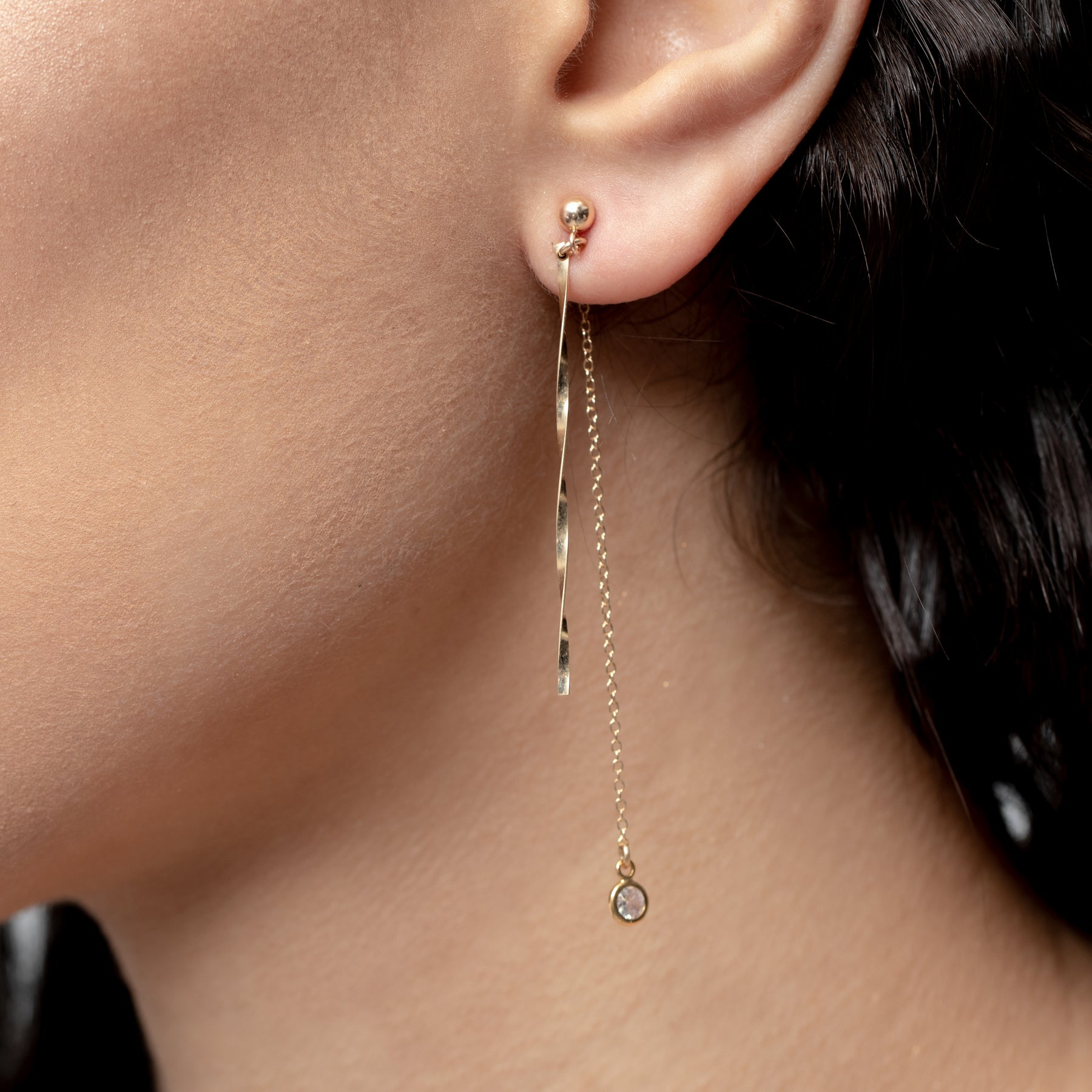 Arete especial en oro laminado 18k compuesto por un pequeño lingote entorchado, acompañado por una cadena que lleva un zircón tipo Tiffany en su extremo. Dicha cadena está enlazada en la tuerca de abrochar lo cual genera un efecto de mucho glamour al llevar puesto.