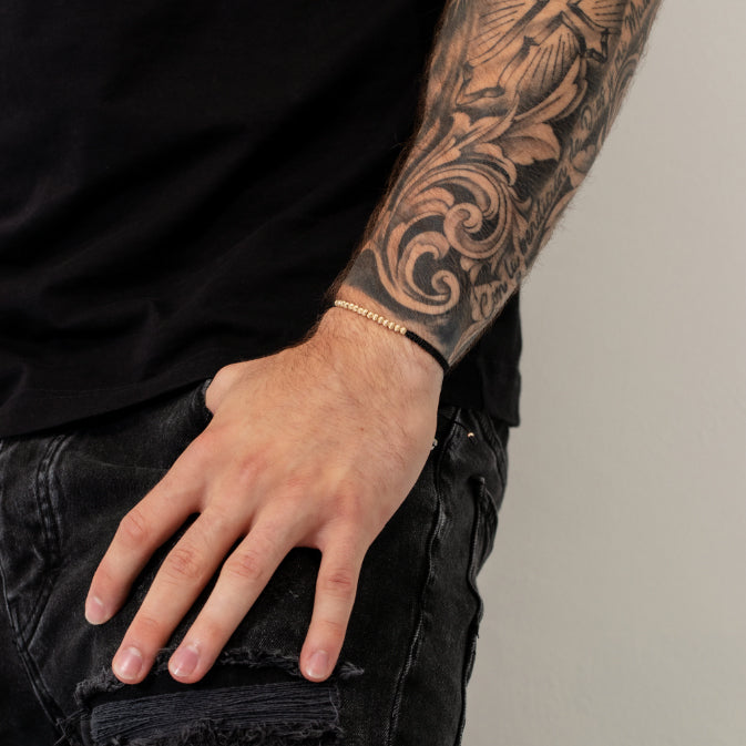 Elegante Pulsera de oro laminado 18k, con una bolas diamantadas acanaladas de 3mm de diámetro y detalles en hilo sintético tejidos por expertos en macramé, Unisex. Única y exclusiva obra de arte de lujo hecha a mano con maestría artesanal.