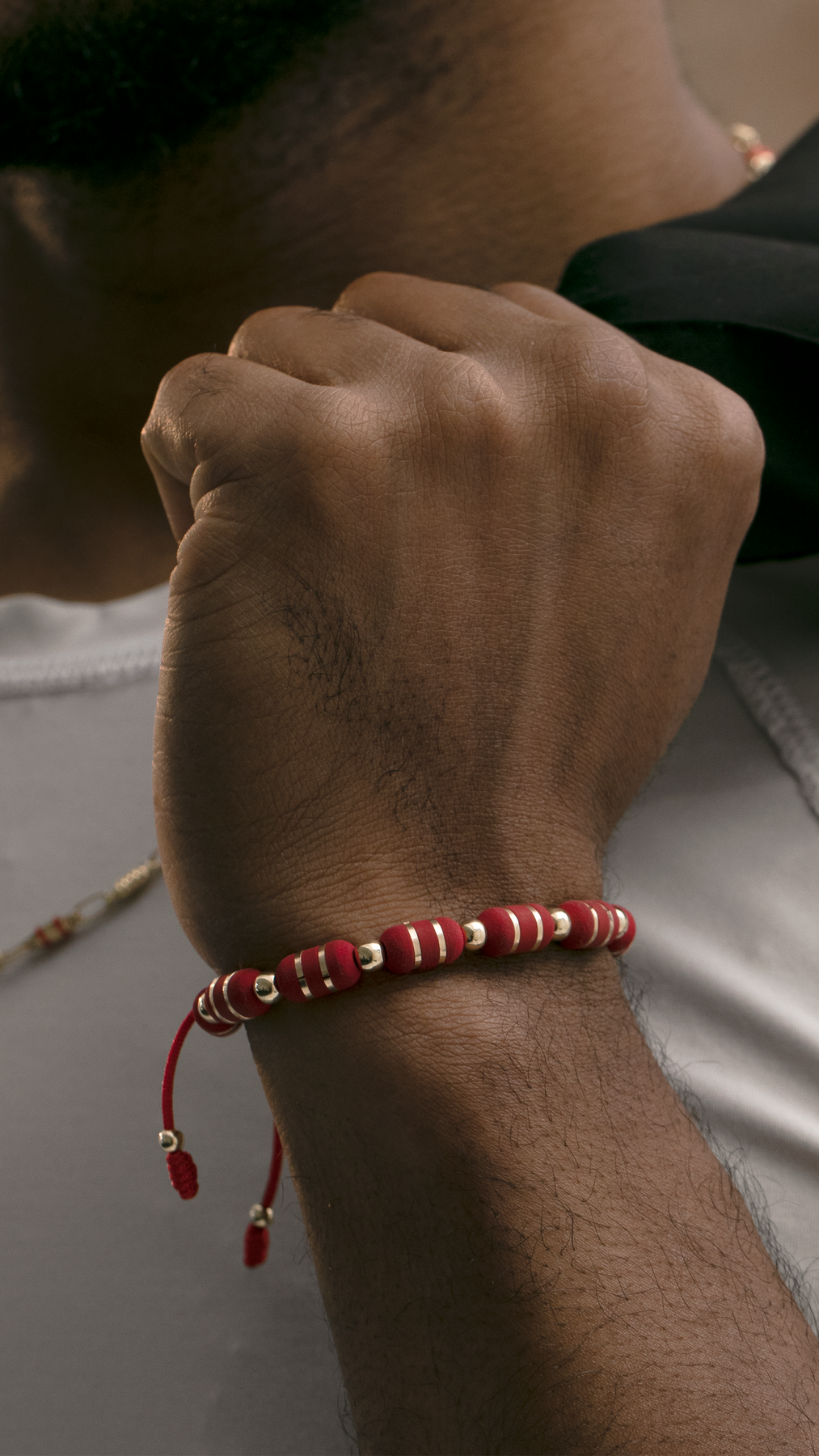 Pulsera en oro laminado 18k Tejida, con balines 5mm y barriles en neopreno con cintas doradas, La calidad de los materiales y técnicas utilizadas logran una pulsera elegante y resistente, diseñada para durar por años.