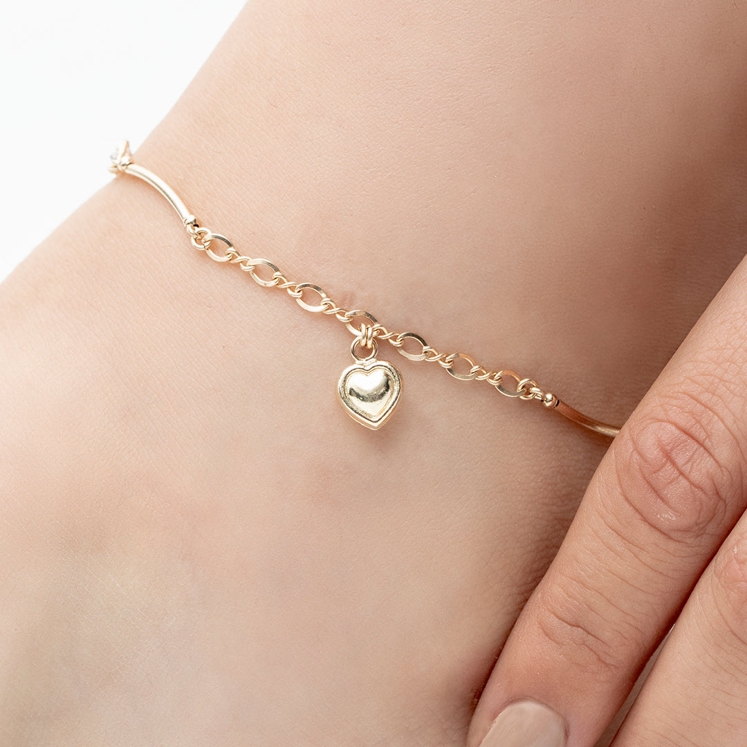 Tobillera de oro laminado con cadena figaro doble ss, acompañada de dije de forma de corazón y con dijes zircones doble argolla.