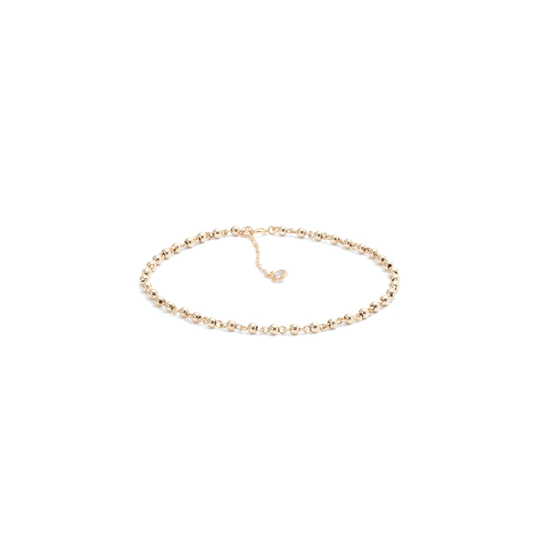 Tobillera artesanal de bolas doradas de 3 mm de diámetro, con cadena para brindar una gradualidad en su ajuste. Elaborado bajo técnicas de alambrismo por artesanos expertos.