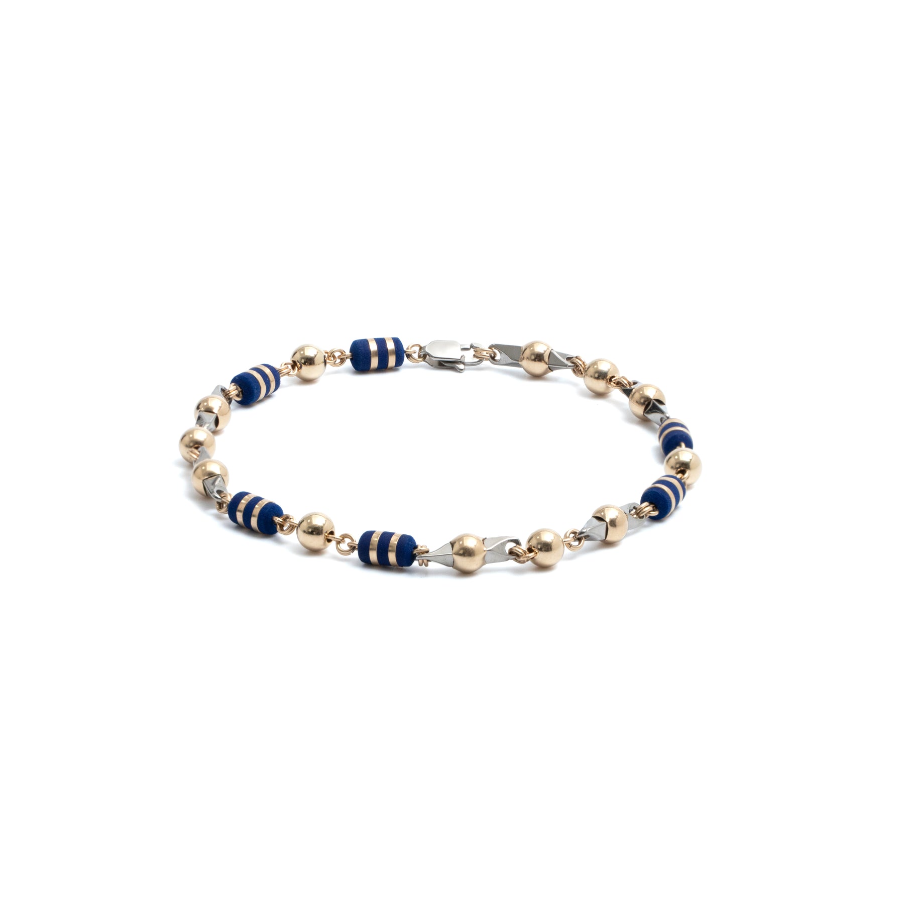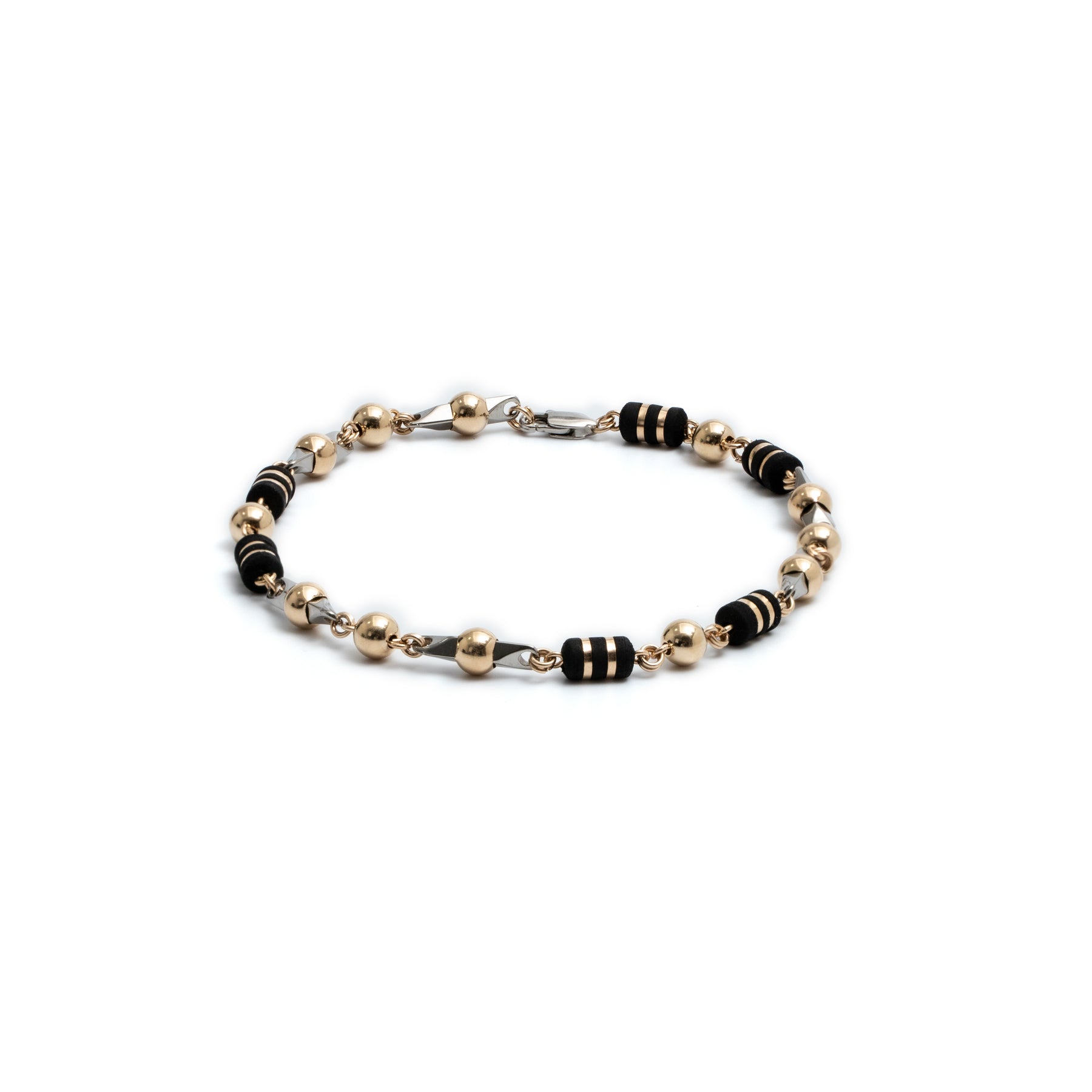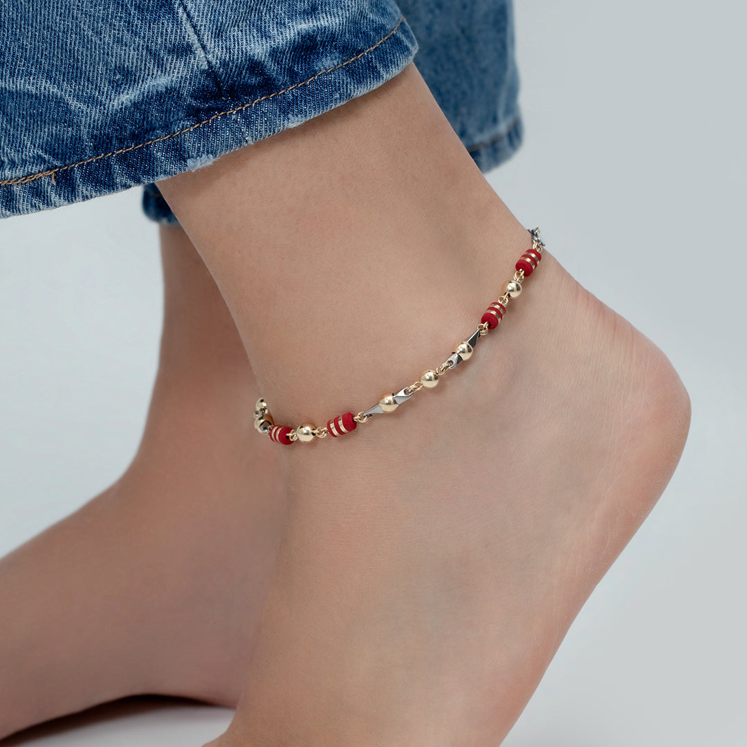 Tobillera exclusiva las cuentas, tipo pin. elaborada con bolas laminadas n6mm doradas las cuales se le hace tecnica de alambrismo artesanal y tambien se incrustan en pin de acero de joyeria 316L ,se acompaña todo esto con barriles de neoprenos argollados con cinta laminada.