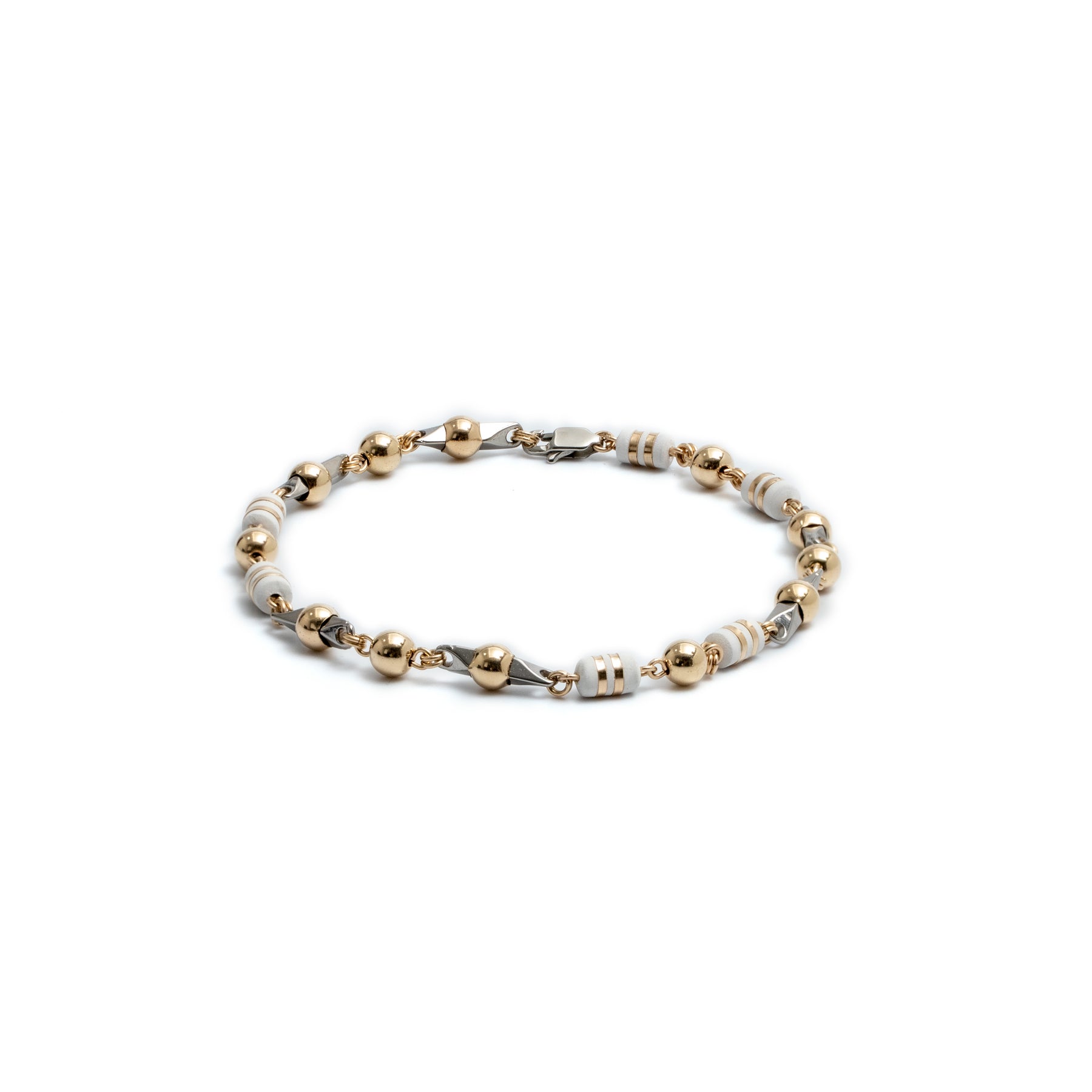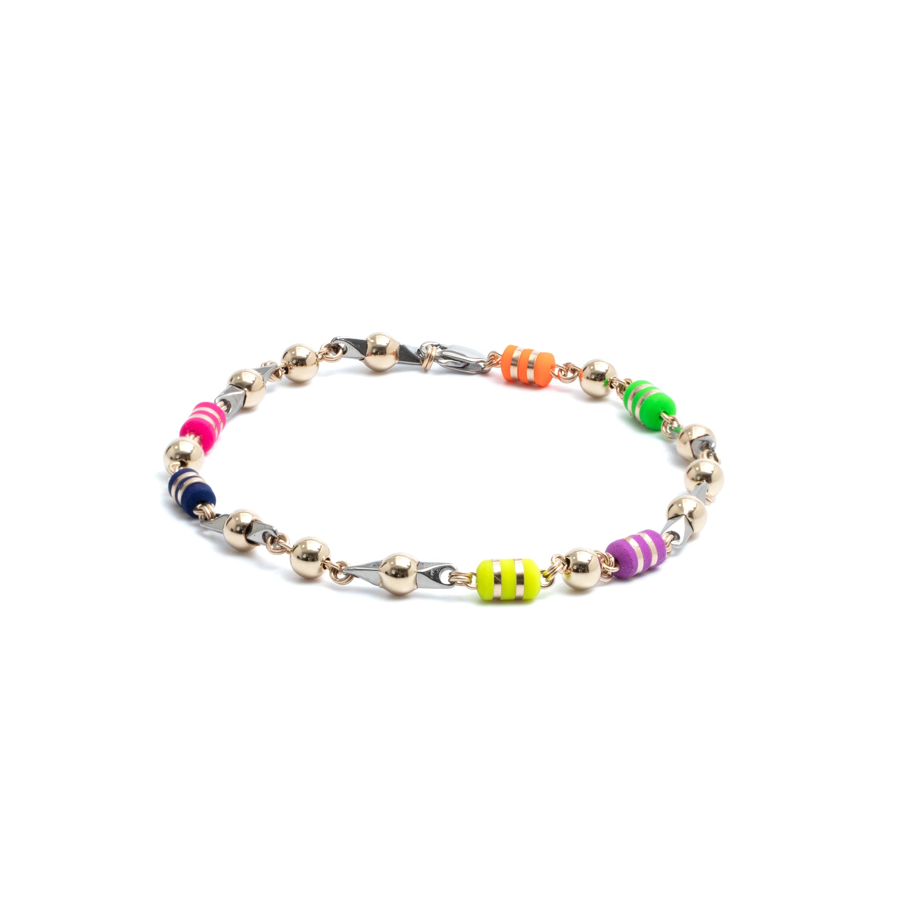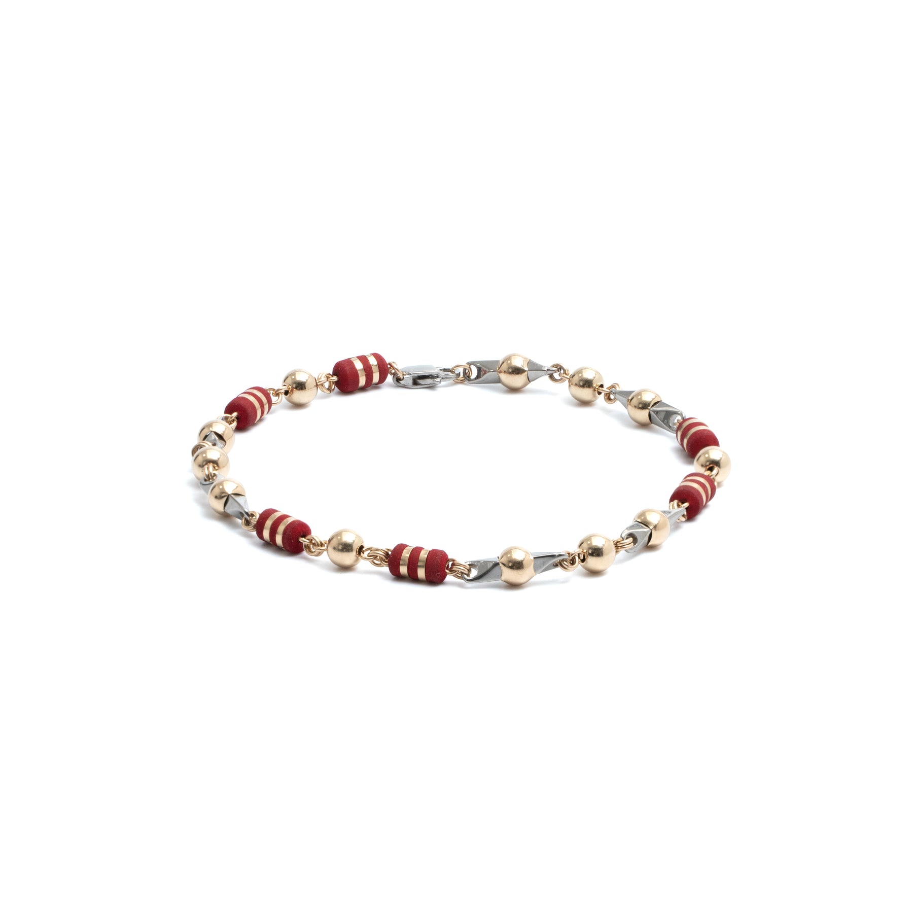 Tobillera exclusiva las cuentas, tipo pin. elaborada con bolas laminadas n6mm doradas las cuales se le hace tecnica de alambrismo artesanal y tambien se incrustan en pin de acero de joyeria 316L ,se acompaña todo esto con barriles de neoprenos argollados con cinta laminada.