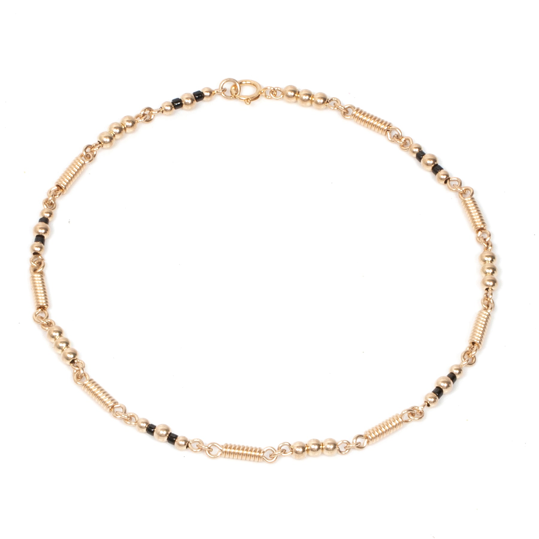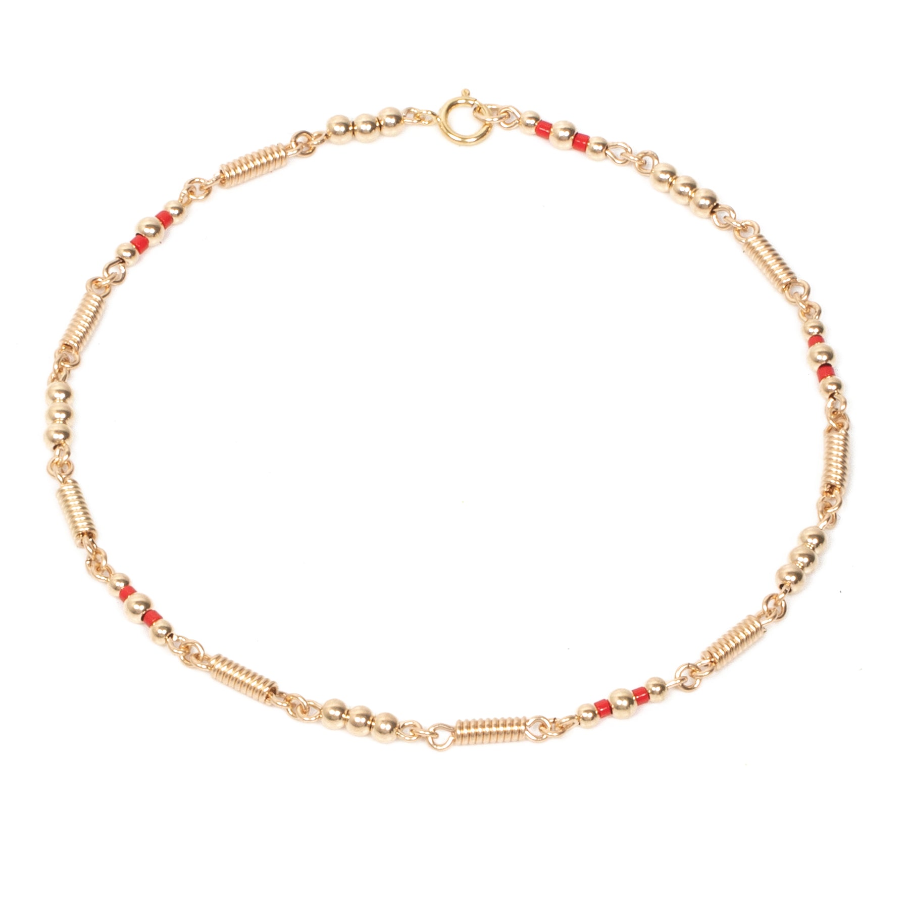 Tobillera en oro laminado dorado 3mm con tornillos artesanales realizados con alambre de oro laminado dorado,también se acompaña de pequeños canutillos de miyuki para brindarle colorido. Todo es elaborado con técnica orfebre por artesanos expertos en el arte.